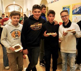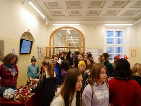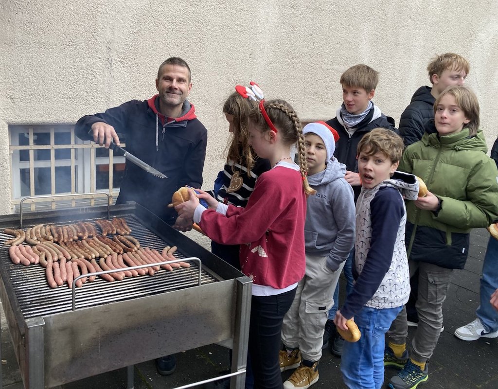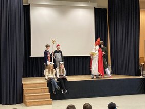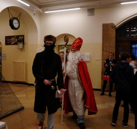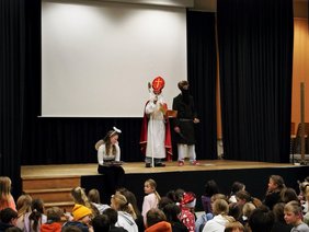 Sobald man das Klingeln der Glocke durchs Schulhaus hört, weiß jeder: Der Nikolaus kommt mit seinem Knecht Ruprecht wieder. An unserem allseits bekannten Weihnachtsmarkt besuchte uns natürlich wieder der Nikolaus. Mittlerweile eine Tradition am EG. Dieses Jahr gab es sogar ein Überraschungsgedicht zur Hellas-Fahrt. Doch auch über alle Klassen wusste er natürlich bestens Bescheid: Was sie angestellt oder auch gut gemeistert haben. Man konnte viel Lob in der Aula hören, aber hier und da konnte man auch ein Seufzen vom Nikolaus vernehmen. Bei manchen Klassen ging sogar der Knecht Ruprecht durch die Reihen und ließ seine Rute so manch einen Schüler streicheln. Doch viel Schlechtes kann man über unsere Schüler und Lehrkräfte ja gar nicht so recht sagen, dachte sich wohl auch der heilige Nikolaus. Deshalb bekam jeder Schüler, natürlich auch Frau von Koenen und Herr Rau, die sich beim Hellas-Gedicht tapfer nach vorne trauten, von den Engeln noch einen Lebkuchen.