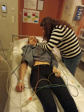 ist ein Angebot des Klinikums Amberg. „Dabei“ waren sieben unserer Sanis und ließen sich in einem Stationszimmer auf der Intensivstation der Inneren Medizin von Intensivpfleger Mario Lutz verkabeln, ein EKG schreiben und Blutdruck messen. Nach allgemeinen Erläuterungen stieg dieser vertieft in das Erregungsleitsystem des Herzens ein. Neben diesen fachlichen Hintergründen wurden wir über die Abläufe auf der Station, dem Betreuungsschlüssel Pfleger/Patient, physischer und psychischer Belastungen durch Schichtarbeit, aber auch die Erfüllung, die in dieser Arbeit steckt, informiert.
